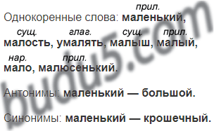 Подбери и запиши однокоренные слова к слову маленький. Над каждым словом напиши, какая это часть речи. Напиши антоним к слову маленький и синоним к нему.