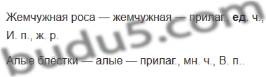 Жемчужная роса — жемчужная — прилаг., мн. ч., И. п., ж. р. Алые блёстки — алые — прилаг., мн. ч., В. п., ж. р.