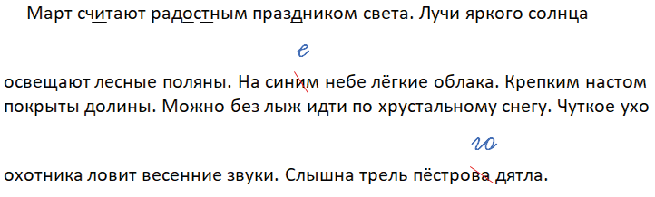 Март считают радостным праздником света. Лучи яркого солнца освещают лесные поляны. На синим небе лёгкие облака. Крепким настом покрыты долины. Можно без лыж идти по хрустальному снегу. Чуткое ухо охотника ловит весенние звуки. Слышна трель пёстрова дятла.