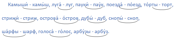 луга́ — ..., пауки́ — ..., поезда́ — ..., то́рты — ..., стрижи́ — ..., острова́ — ..., дубы́ — ..., снопы́ — ..., ша́рфы — ..., голоса́ — ..., арбу́зы — ... .