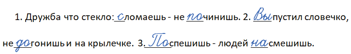 1. Дружба что стекло: _ломаешь - не __чинишь. 2. __пустил словечко, не __гонишь и на крылечке. 3. __спешишь - людей __смешишь.