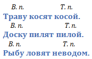 Траву косят косой. Доску пилят пилой. Рыбу ловят неводом. Гвоздь забивают молотком. Одежду шьют иглой.
