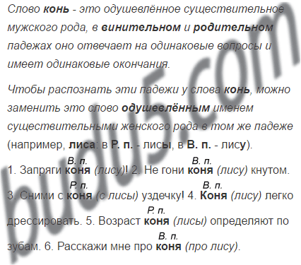 Запряги коня (В. п.)! Не гони коня (В. п.) кнутом. 3. Сними с коня (Р. п.) уздечку! Коня (В. п.) легко дрессировать. Возраст коня (Р. п.) определяют по зубам. Расскажи мне про коня (В. п.).