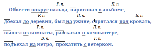 Обвести ... па́льца, нар..совал ... альбоме, доехал ... д..ревни, был ... у́ж..не, спрятался ... кр..вать, вышел ... к..мнаты, расск..зал ... комп..ютере, под...ехал ... метро3, прок..тить ... вет..рком.
