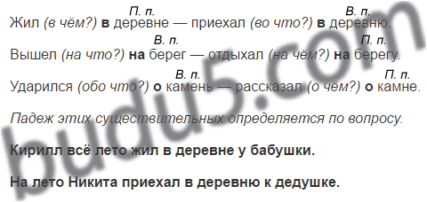 Жил (в чём? в деревне (П. п.) - приехал (во что?) в деревню (В. п.). Вышел (на что?) на берег (В. п.) - отдыхал (на чём?) на берегу (П. п.). Ударился (обо что?) о камень (В. п.) - рассказал (о чём?) о камне (П. п.).
