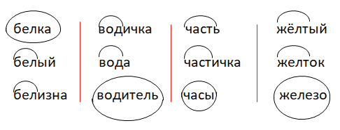 | белка белый белизна | водичка вода водитель | часть частичка часы | жёлтый желток железо |