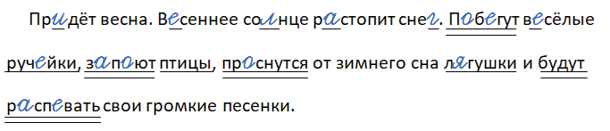 Пр_дёт весна. В_сеннее со_нце р_стопит сне_. П_б_гут в_сёлые руч_йки з_п_ют птицы пр_снутся от зимнего сна л_гушки и будут р_сп_вать свои громкие песенки.