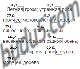 Окончания имён прилагательных: м. р. - ой, ий, ый; ж. р. - ая, яя; ср. р. - ое, ее.