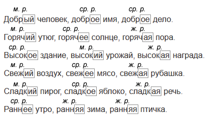 Значения словосочетаний. Добрый человек - человек, делающий добро; доброе имя - хорошее мнение о человеке; доброе дело - дело, сделанное ради блага кого-то другого. Горячий утюг - нагретый; горячее солнце - солнце, которое излучает тепло, горячая пора - время, когда очень много работы. Высокое здание - много этажей, высокий урожай - урожай большого объёма, высокая награда - значимая награда. Свежий воздух - воздух, не потерявший своих естественных качеств, свежее мясо - мясо, которое появилось только что, свежая рубашка - чистая, постиранная рубашка. Сладкий пирог - пирог, содержащий большое количество сахара, сладкое - яблоко - имеющее сладкий вкус, сладкая речь - льстивые слова. Раннее утро - только-только наступившее утро, ранняя зима - зима, пришедшая раньше срока, ранняя птичка - человек, который рано встаёт.