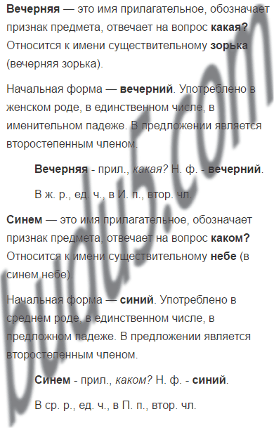 Вечерняя - прил., (какая?). Н. ф. - вечерний. В ж. р., в ед. ч., в И. п.. Подлежащее.
