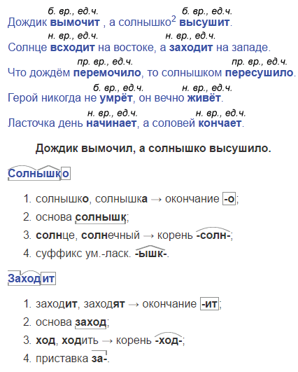 Слова для справок: кончает, начинает; заходит2, всходит; вымочит, высушит; умрёт, живёт; пересуши́ло, перемочи́ло.