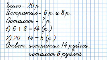 У Вани было 20 рублей. На покупку карандаша и ручки он истратил 6 и 8 рублей.